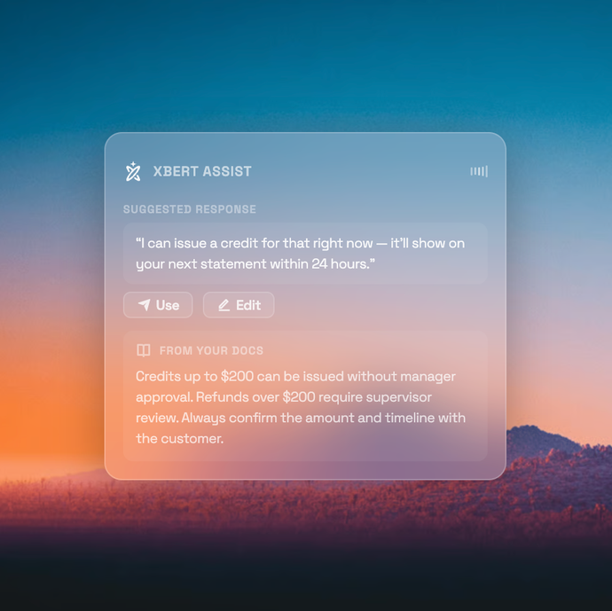 Real-time coaching that makes every agent your best agent. XBert surfaces the right knowledge, suggests responses, and flags sentiment shifts — all mid-conversation.